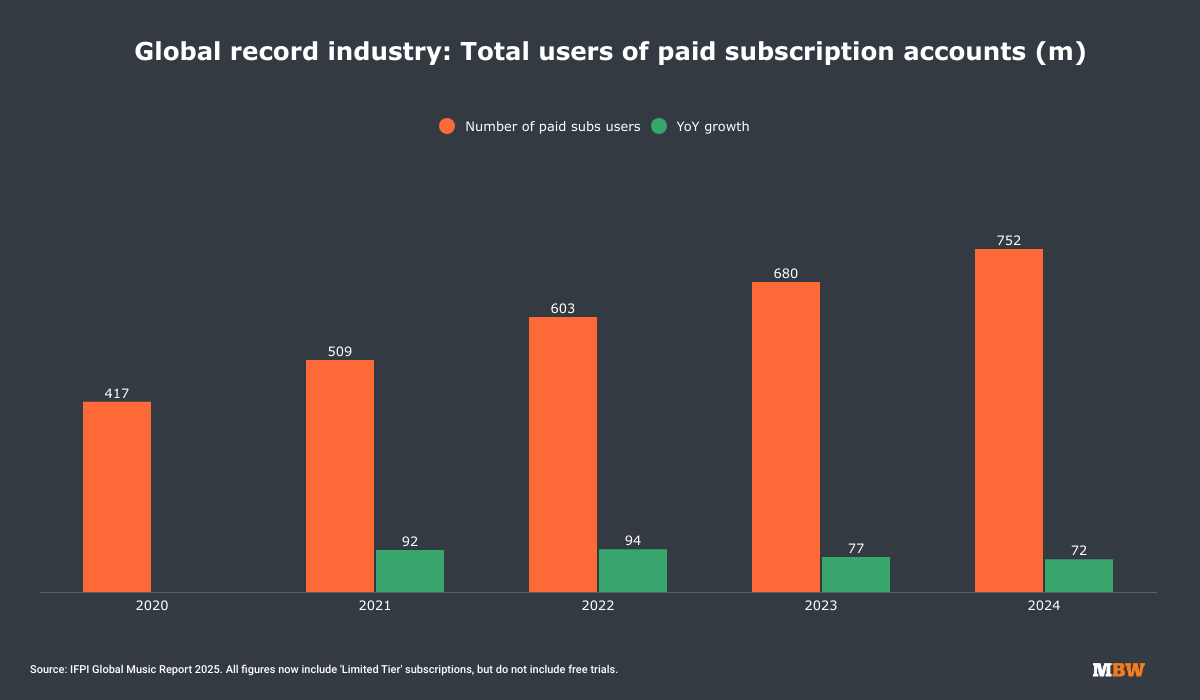 The total number of users of paid music streaming subscription accounts grew 10.6% YoY to 752 million globally in 2024.