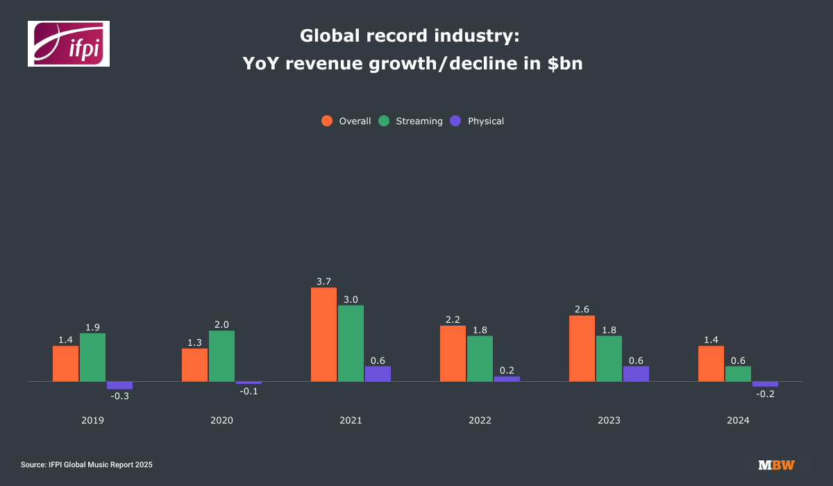 The IFPI previously reported that the global industry grew by 10.2% YoY in 2023, suggesting the percentage growth of the business roughly halved in 2024 vs. the prior year.