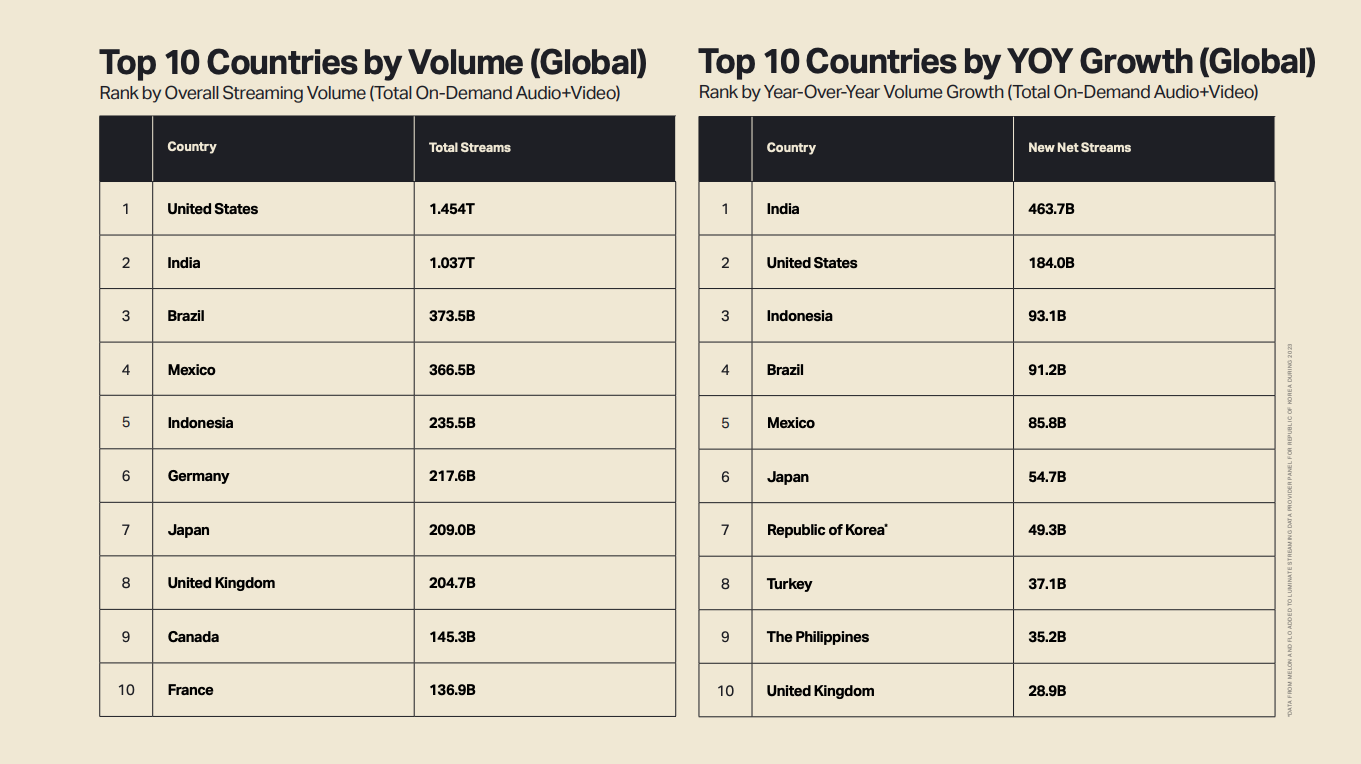 It was also nearly three times larger than the No.3 country, Brazil (373.5 billion streams).