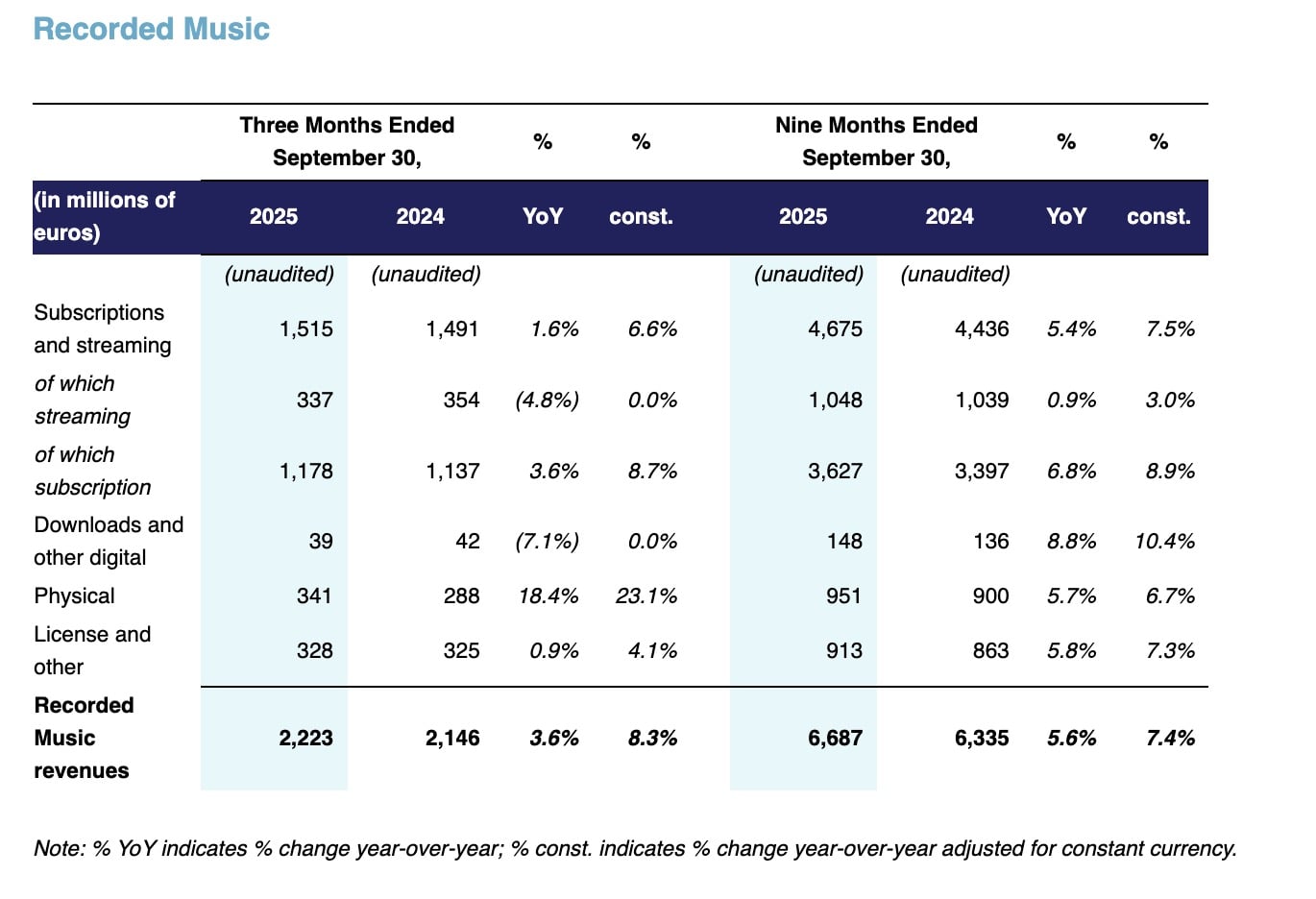 Universal’s overall Recorded Music revenue for the third quarter of 2025 was €2.223 billion ($2.59bn), up 8.3% YoY at constant currency.