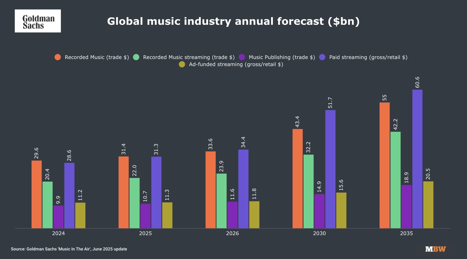 Goldman projects the recorded music market to grow from $29.6 billion in 2024 to $31.4 billion in 2025, $33.6 billion in 2026, $43.4 billion in 2030, and $55.0 billion in 2035 (see below).