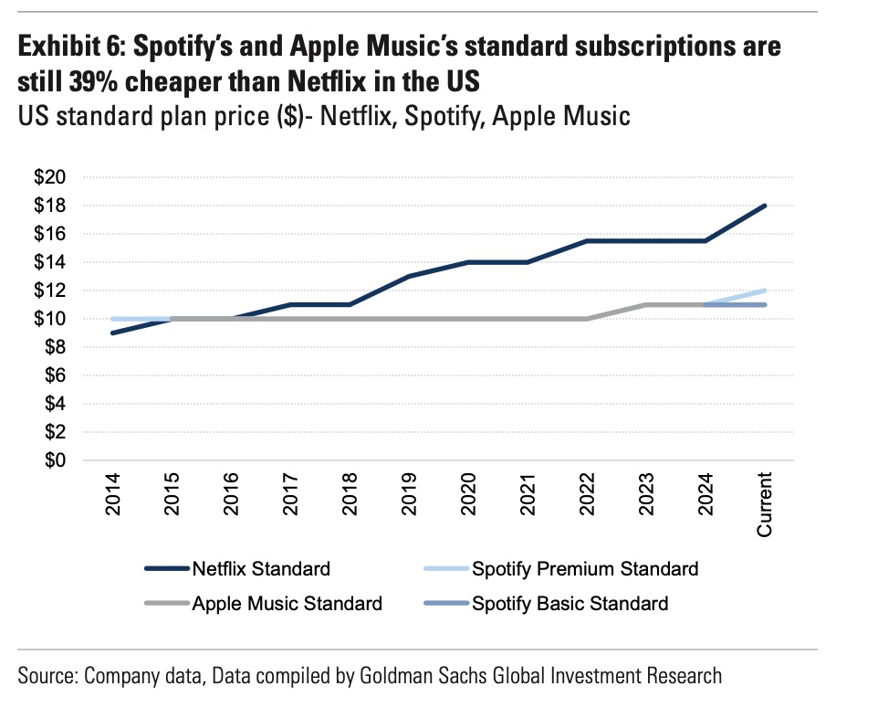 Goldman Sachs expects music streaming services to implement regular pricing increases, with second rounds of price hikes typically occurring 12-18 months after initial increases.