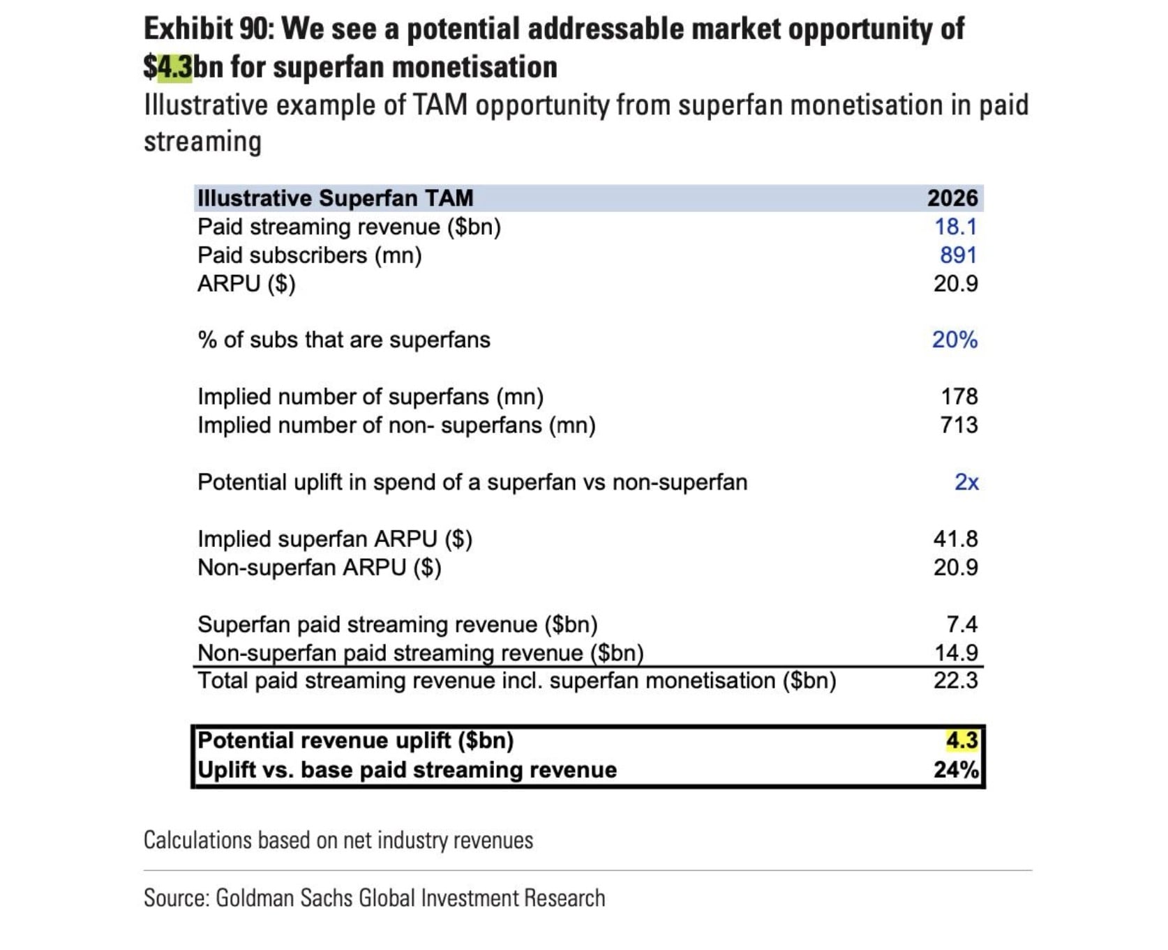 Goldman Sachs identifies superfan monetization as a significant opportunity for the music industry, estimating a potential annual revenue uplift of $4.3 billion based on 2026 projections.