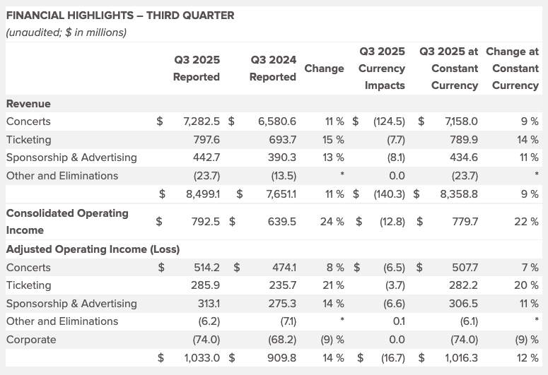 The concert giant’s revenue climbed 11% YoY in Q3 2025 to $8.5 billion from $7.65 billion in Q3 2024, according to its latest quarterly report published Tuesday (November 4).
