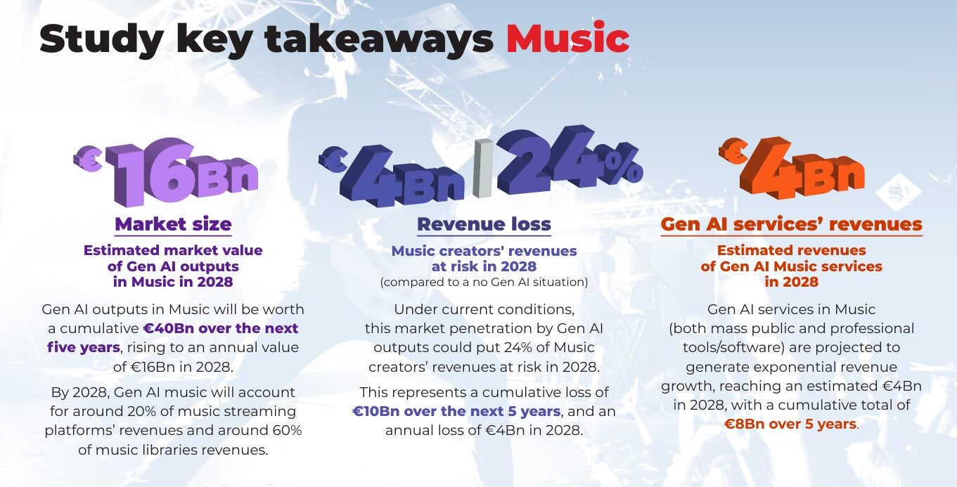It predicts that 30% of music creators’ digital revenues will be taken by AI, while 22% of radio, TV, live, and background music revenues will be lost, and 21% of CD and video revenue will be lost.