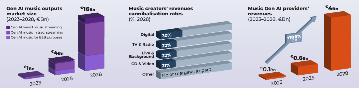 Gen-AI services in music (i.e., tools that help in the music creation process) will be worth a cumulative €8 billion ($8.4 billion) by 2028, with an annual value of €4 billion ($4.2 billion) by then.
