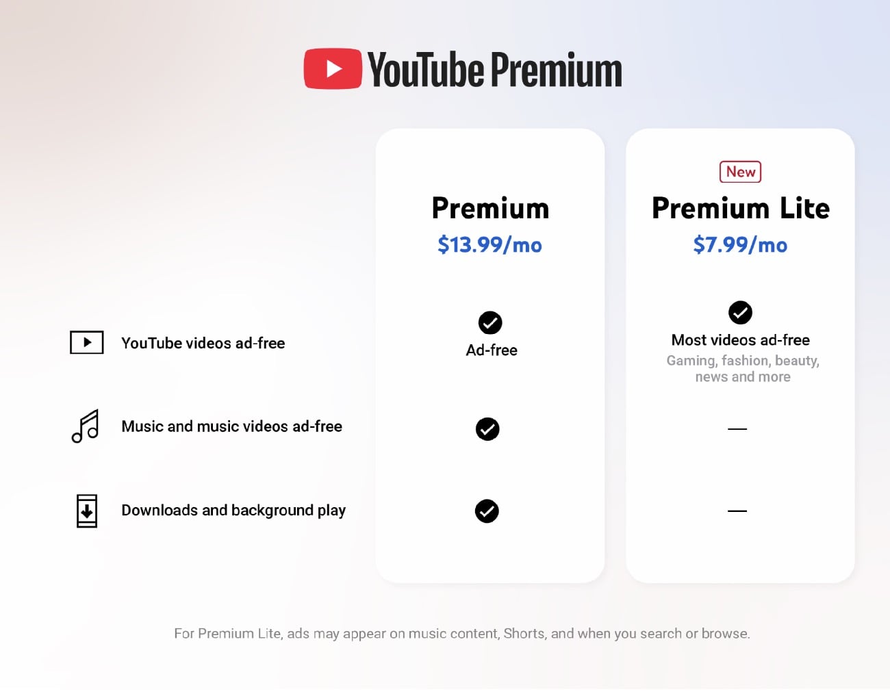 A Premium Lite subscription will cost $7.99 per month. A full YouTube Premium subscription costs $13.99 per month for an individual plan in the United States. A standalone YouTube Music Premium plan costs $10.99 per month.