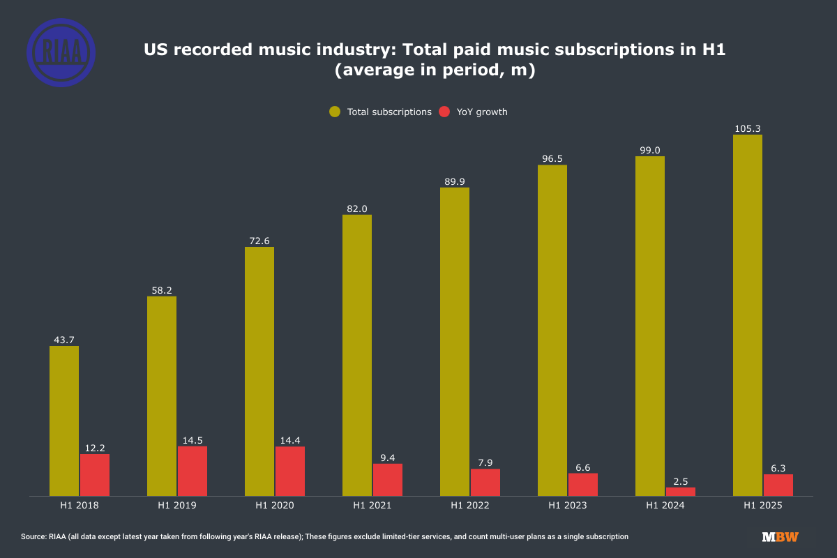 The United States’ recorded music industry saw revenue growth of just 0.9% YoY in the first half of 2025.