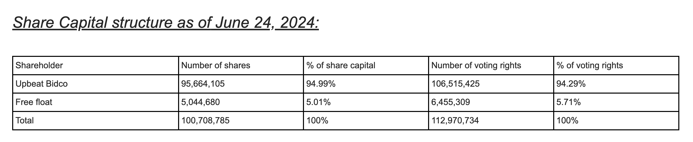 Believe’s share capital structure as of June 24, with Ladegaillerie’s consortium (Upbeat Bidco) owning just under 95% of shares