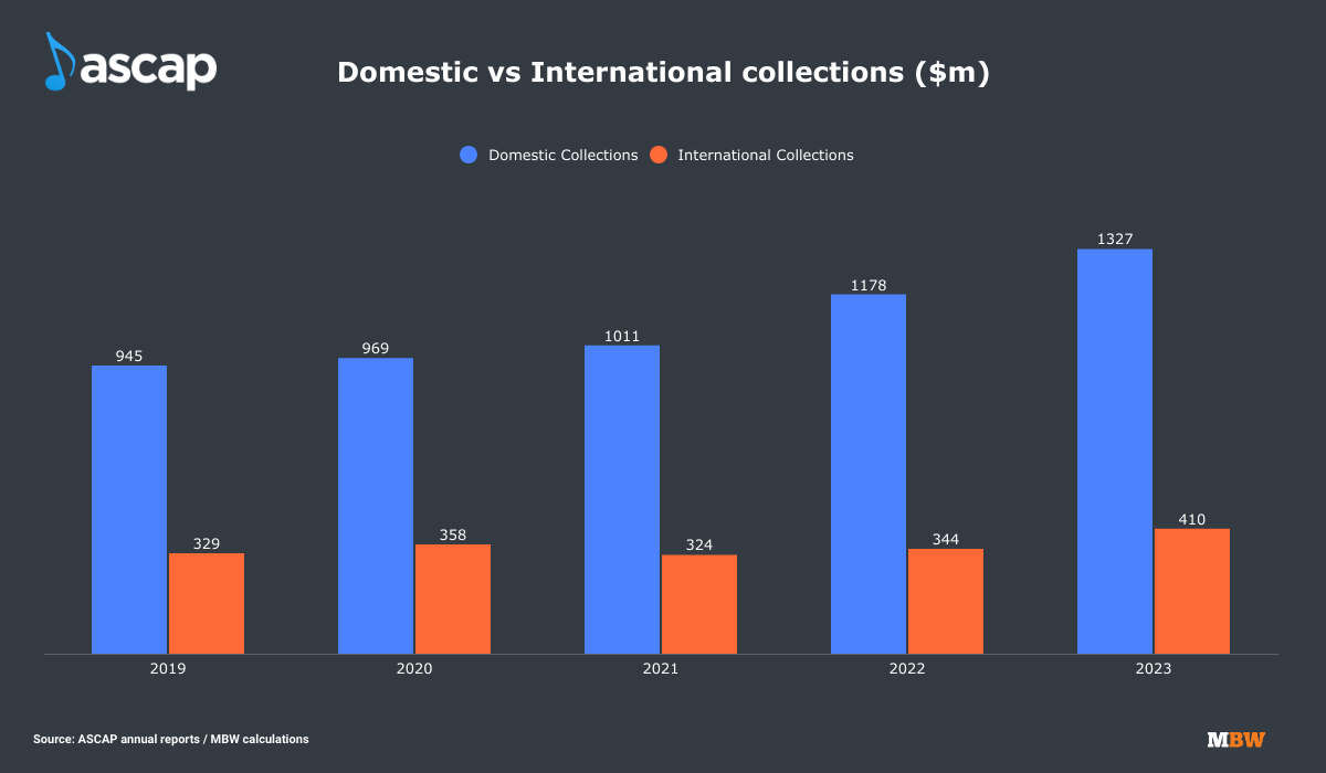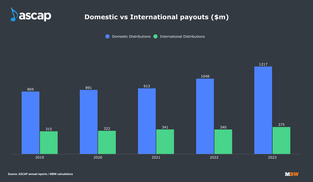 Within the PRO’s annual reports, it confirms how much of its annual collections and member payouts have been generated domestically (in the US) and internationally (outside the US).