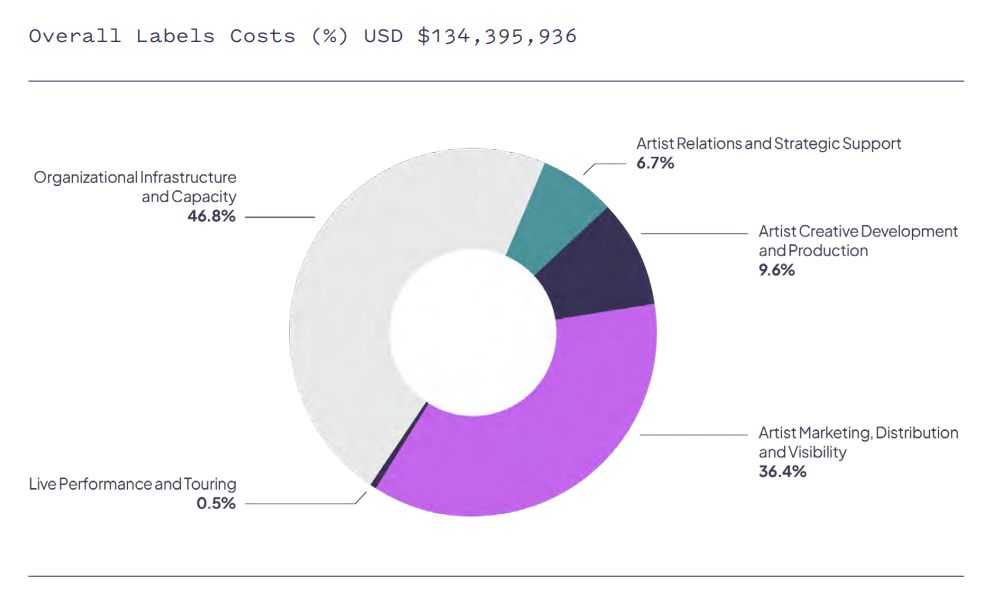 Of that $236,197 spent per artist, the largest share (46.8%) went towards organizational infrastructure and capacity. The share of label spending that went towards artist marketing, distribution and visibility support amounted to 36.4%. Artist creative development and production accounted for 9.6% of labels’ costs.