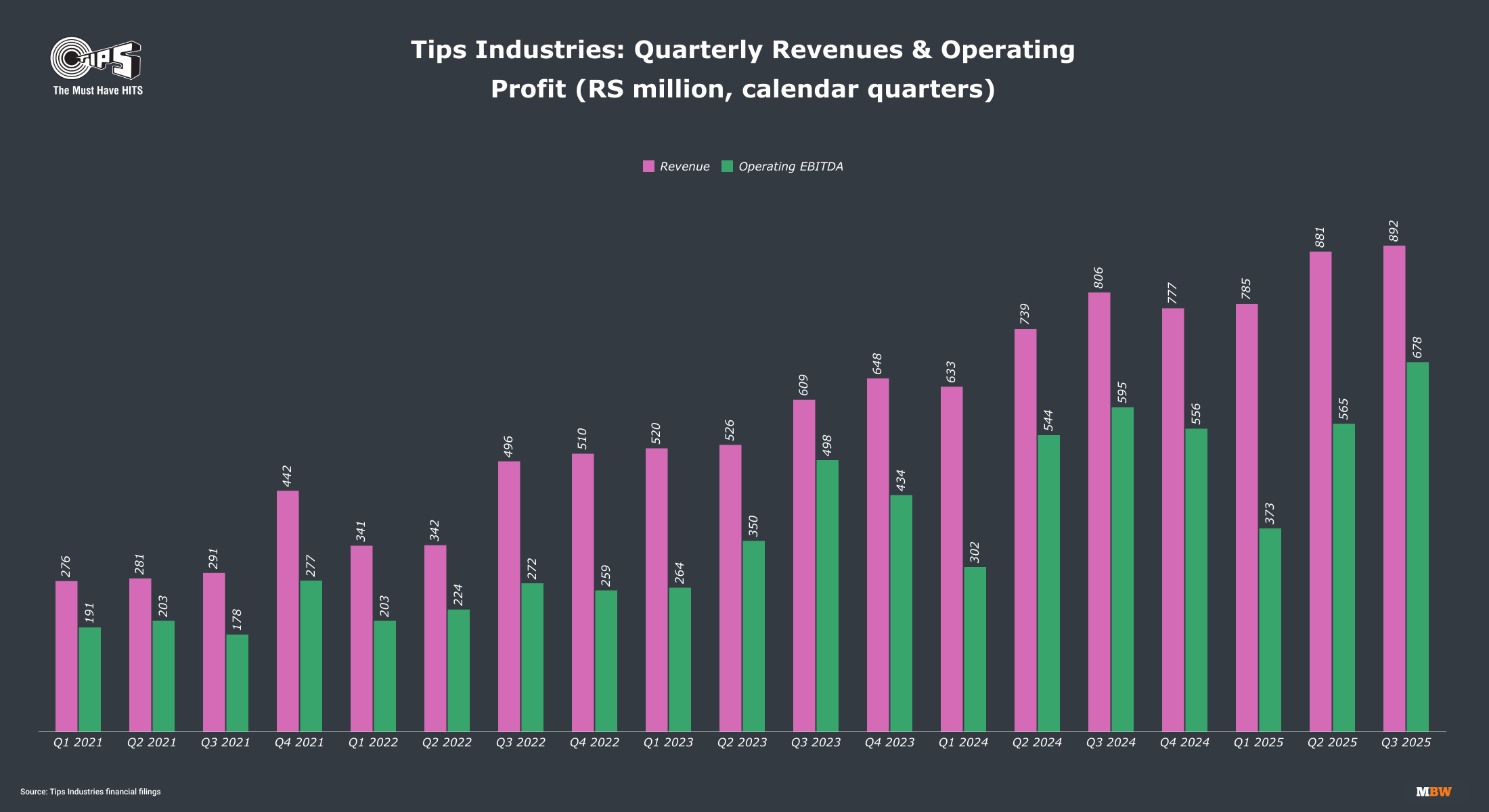 Tips’ Operating EBITDA for the quarter came in at INR ₹678 million ($7.8 million), up 14% YoY. Operating EBITDA margin expanded to 67.8%, from 59.5% a year earlier.