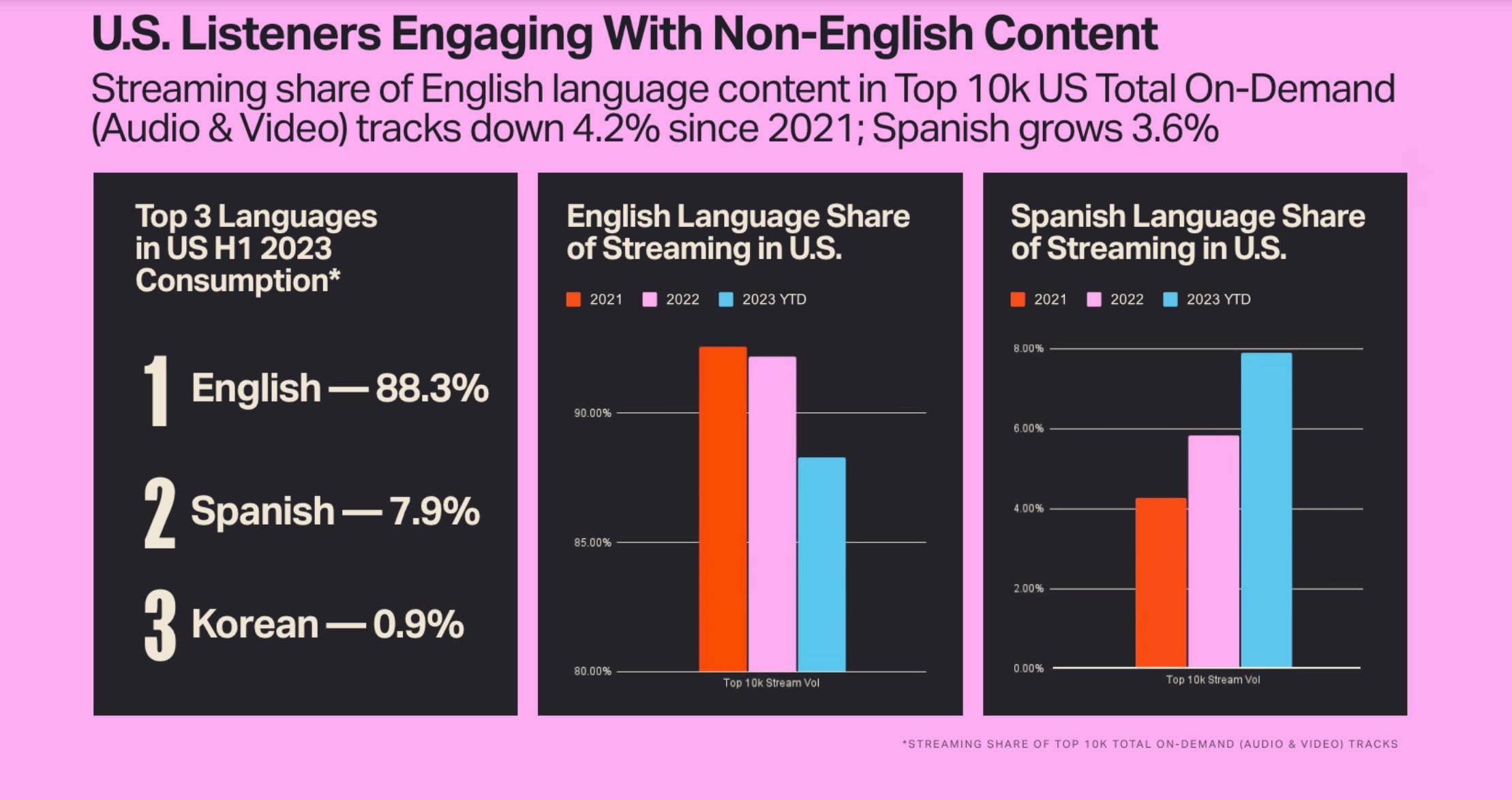 According to Luminate’s mid-year music report, in the United States, in H1, the streaming share of English language content in the Top 10,000 total on-demand (audio and video) tracks was down 4.2% since 2021.