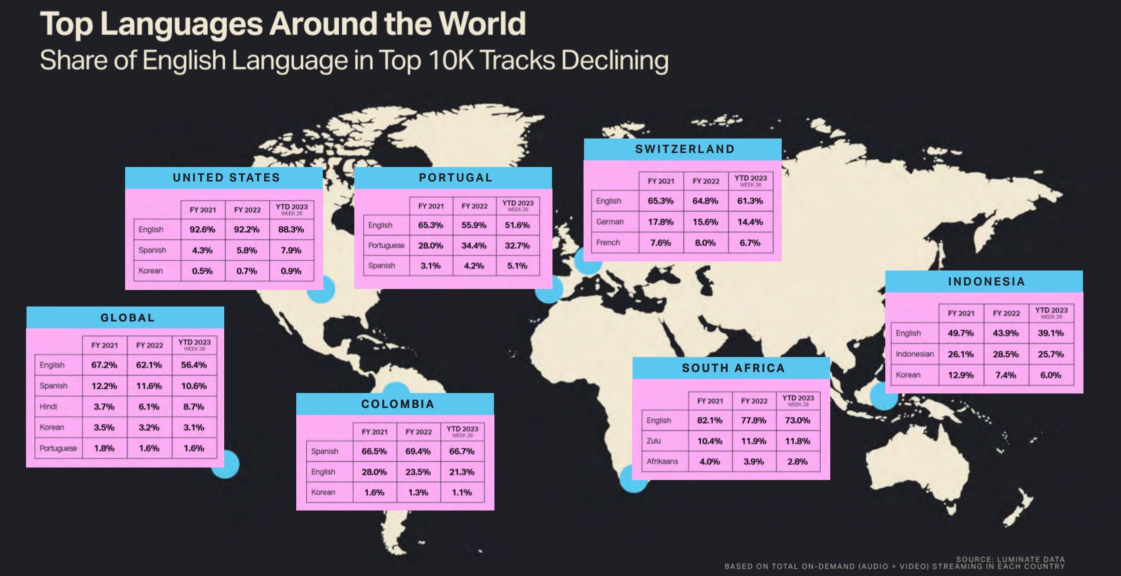 In the first half of 2023, English language music’s share of the Top 10,000 total on-demand (audio and video) tracks globally fell to 56.4%.
