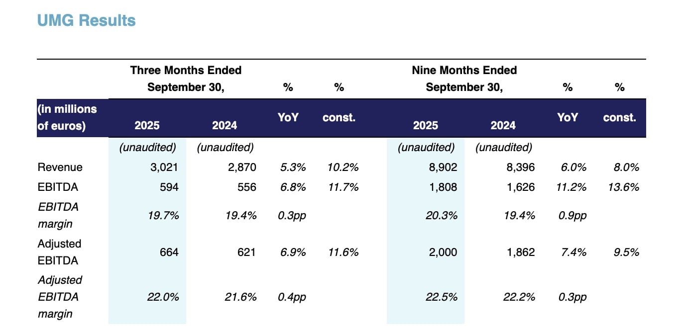 In Q3 2025, UMG’s EBITDA (earnings before interest, taxes, and depreciation) grew 11.7% YoY at constant currency to €594 million ($693.84m).
