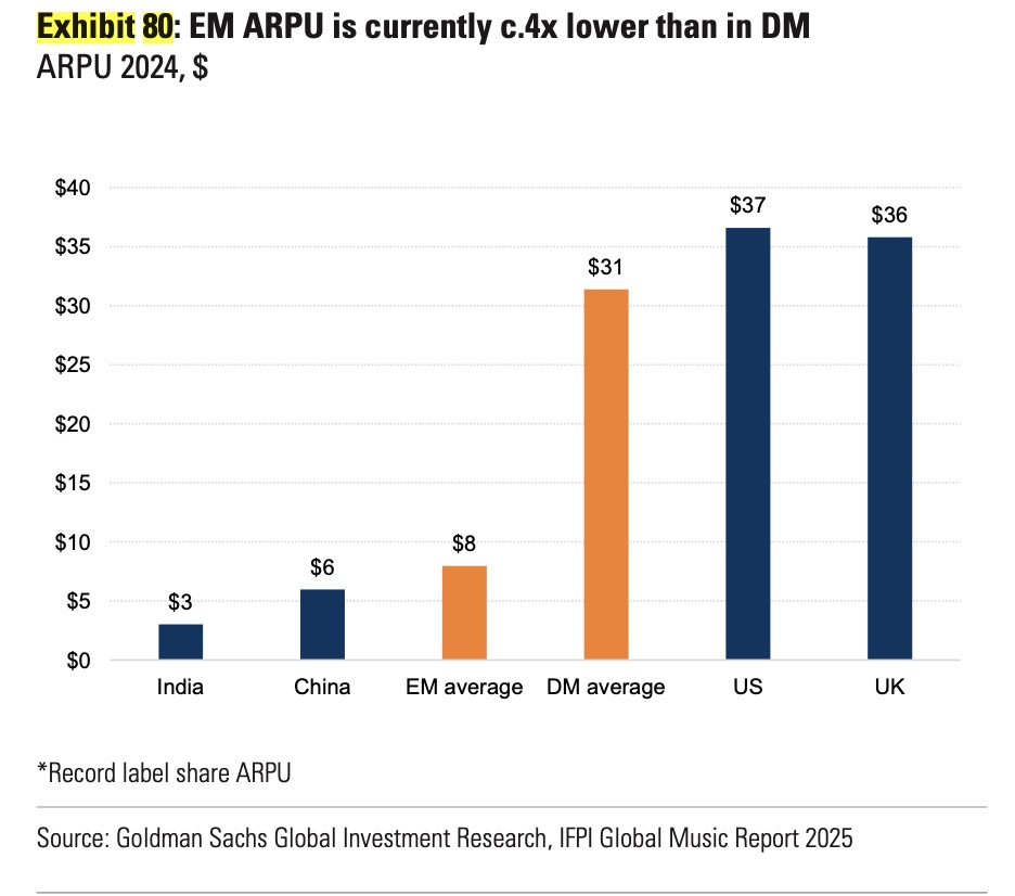 Goldman calculates – based on IFPI figures – that annual ’emerging market’ ARPU sat at around USD$8 in 2024, compared to USD$31 in ‘developed’ markets.
