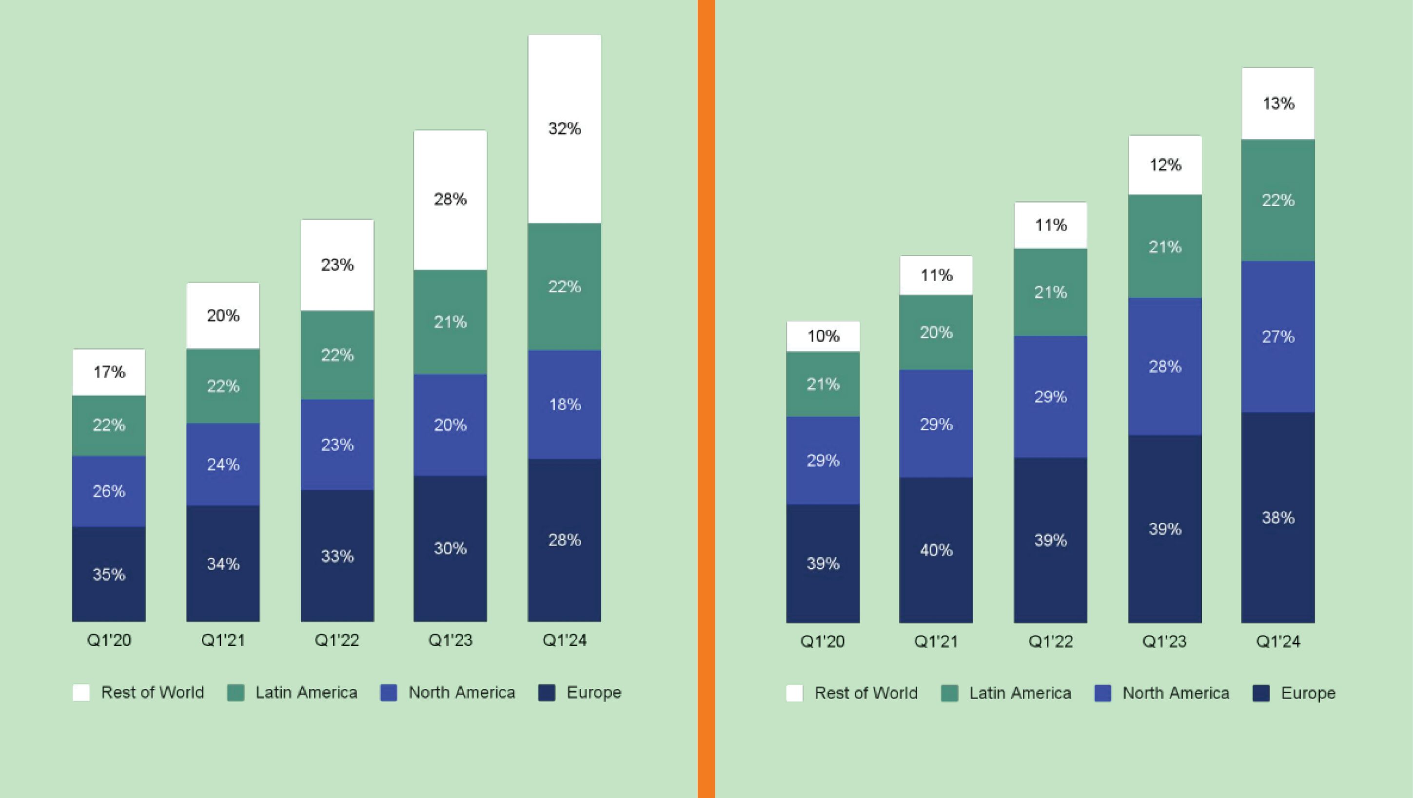 - According to SPOT, of its 615 million total MAUs at the end of Q1 2024, North America and Europe (UK included) jointly claimed 46% of them; and