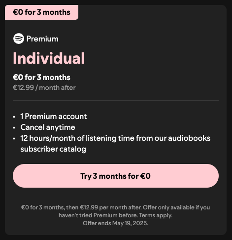 Spotify’s Premium Individual subscription price in the Netherlands now stands at EUR 12.99 per month, but with a three-month introductory free trial.