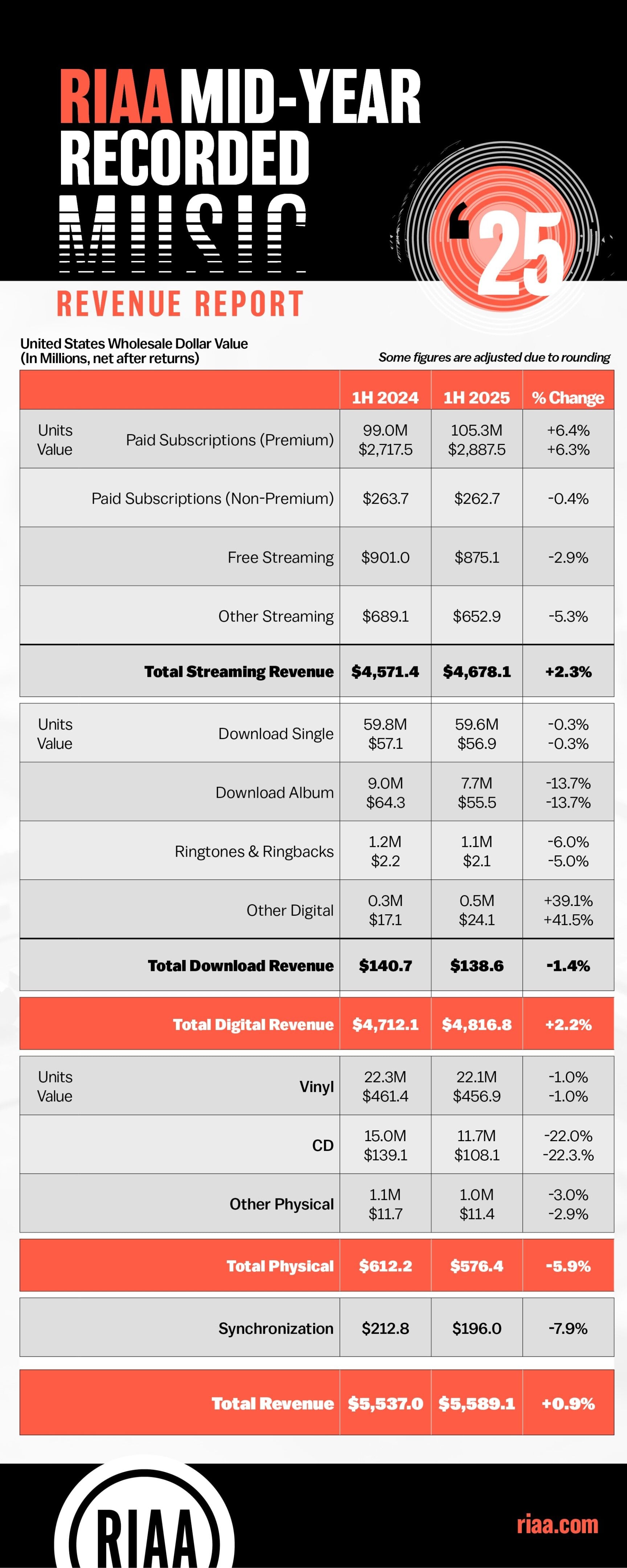 “These numbers show a stable and sustainable foundation as music continues to be one of America’s strongest exports,” said RIAA VP of Research Matt Bass. “Aligning our reporting to international standards allows us to tell that story more clearly than ever.”
