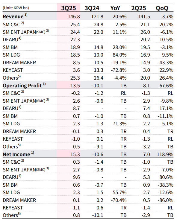 SM Entertainment Japan posted an 11.1% YoY jump in revenue to KRW 24.4 billion ($17.6 million) on the back of larger-scale concerts in the Japanese market. SM Brand Marketing (SM BM) posted revenue of KRW 18.9 billion ($13.6 million), driven by stronger album and merch sales.
