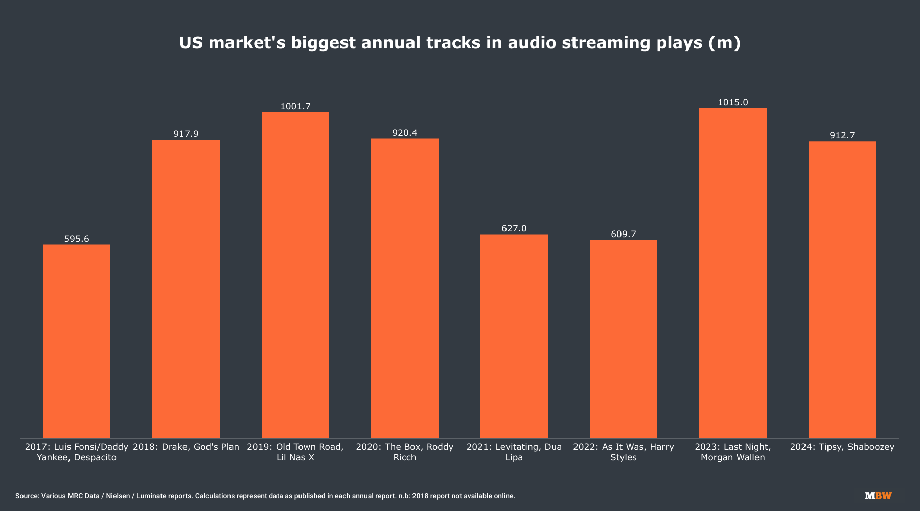Additionally, you can see a chart showing the No.1 audio on-demand streaming track in each year, with total audio plays.