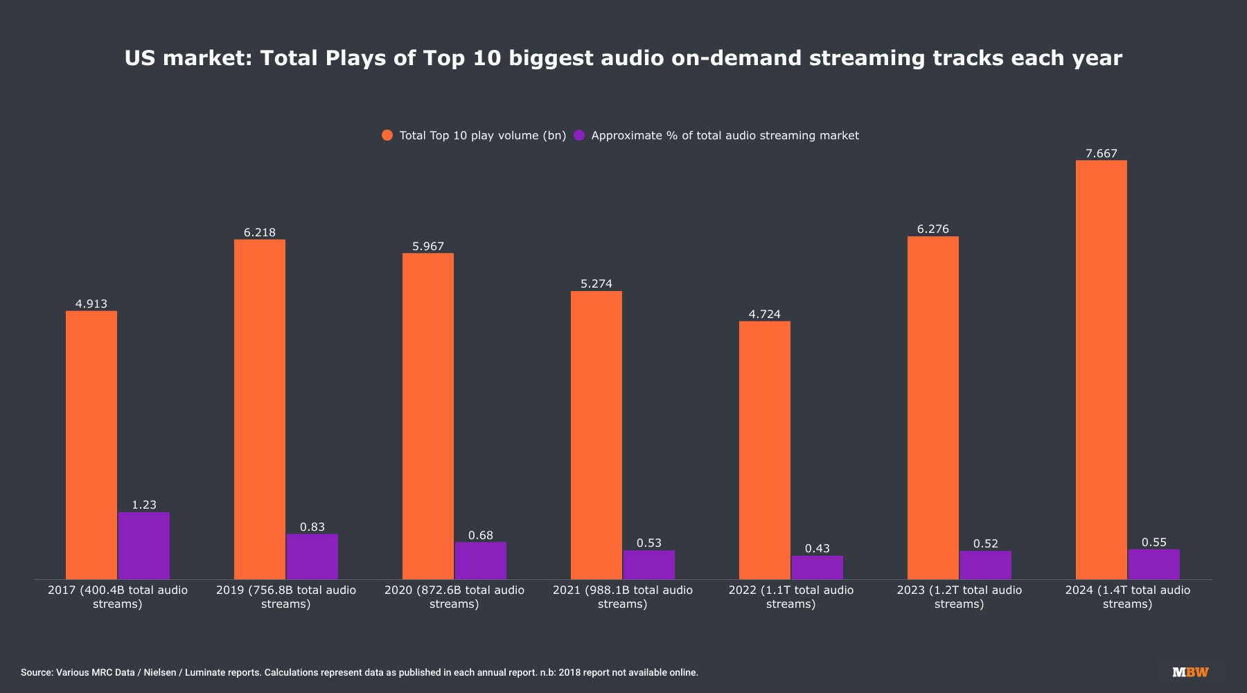 From this data, MBW is able to monitor the market share of the Top 10 biggest hits in the period, and how that market share (vs. total audio streams) compares to prior years.