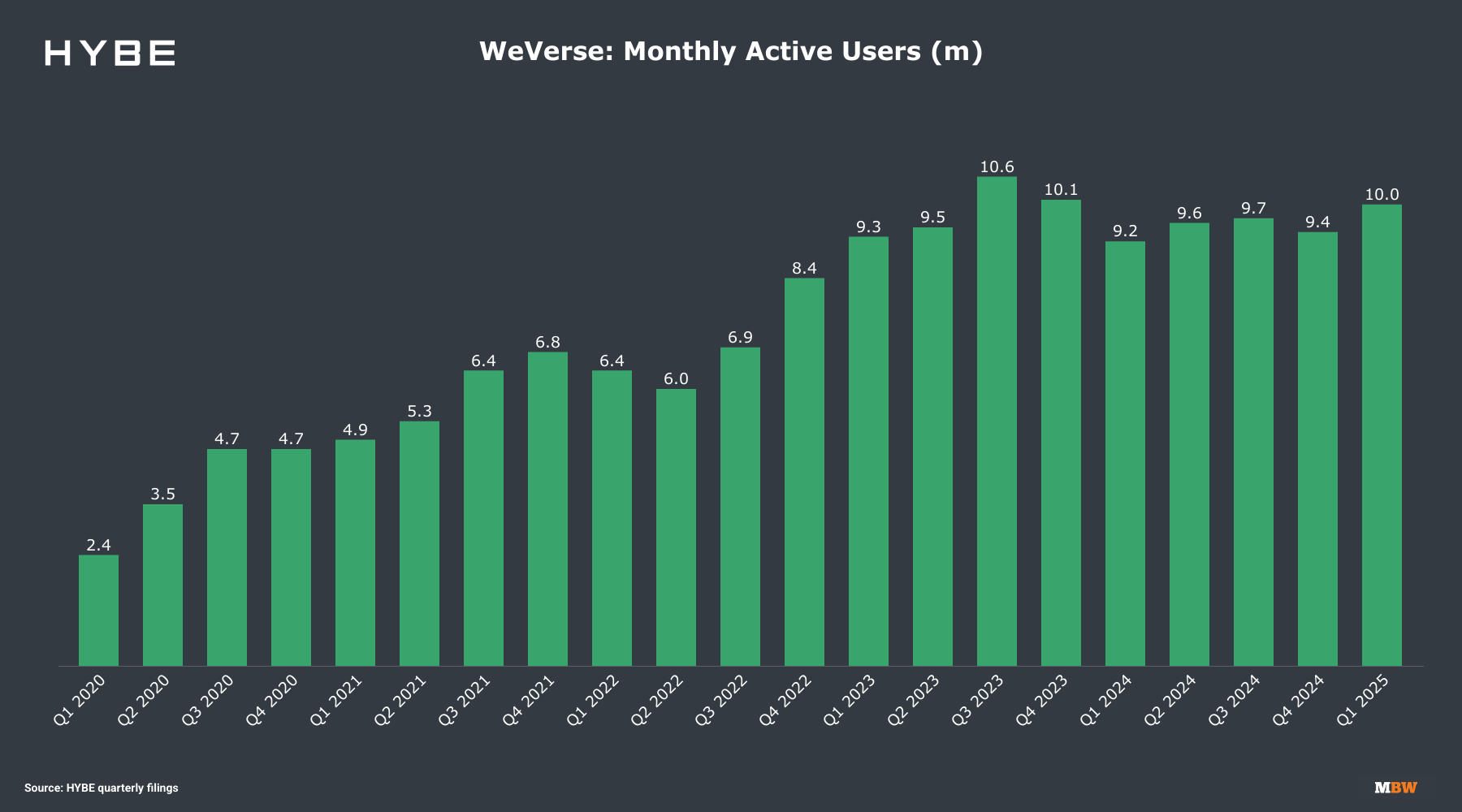 The company’s “artist-indirect involvement segment,” which includes the Weverse platform, saw revenues jump 23.7% YoY to KRW 178.1 billion ($124 million). Weverse clocked 10 million monthly active users (MAUs) in Q1, up from 9.4 million a quarter earlier and up from 9.2 million a year earlier.