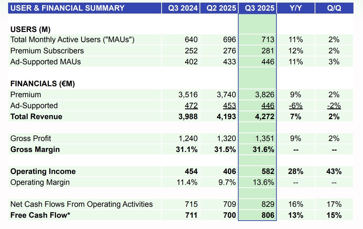 “The business is healthy. We’re shipping faster than ever. And we have the tools we need – pricing, product innovation, operational leverage, and eventually the ads turnaround – to deliver both revenue growth and profit expansion,” said Daniel Ek, Spotify Founder & CEO (who will be moving into an Executive Chairman role in Q1 2026).