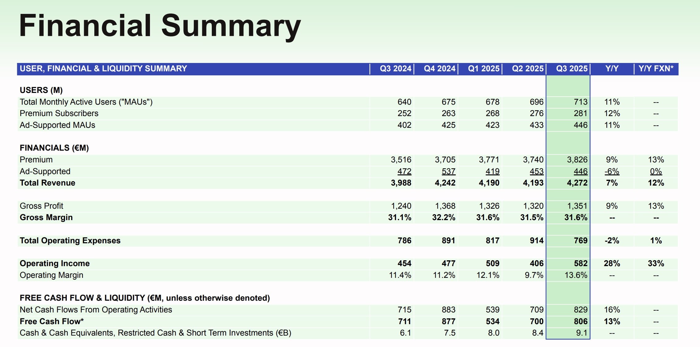 Spotify generated EUR €4.272 billion (USD $4.99bn) in total quarterly revenue in Q3 (including Premium and ad-supported), up 12% YoY at constant currency.