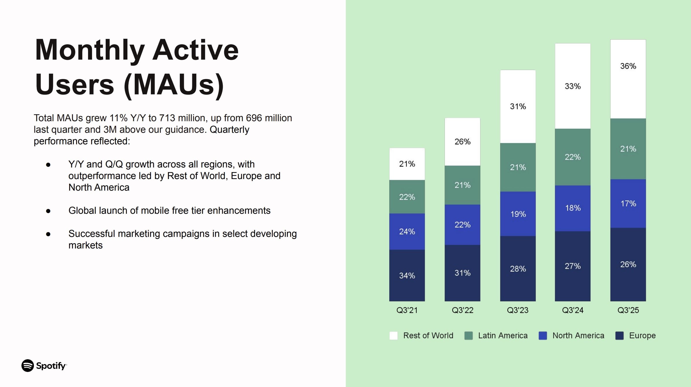 That was up +17 million MAUs from the 696 million reported for the prior quarter (Q2 2025), and above guidance by 3 million (Spotify forecast that it would reach 710 million MAUs in Q3).