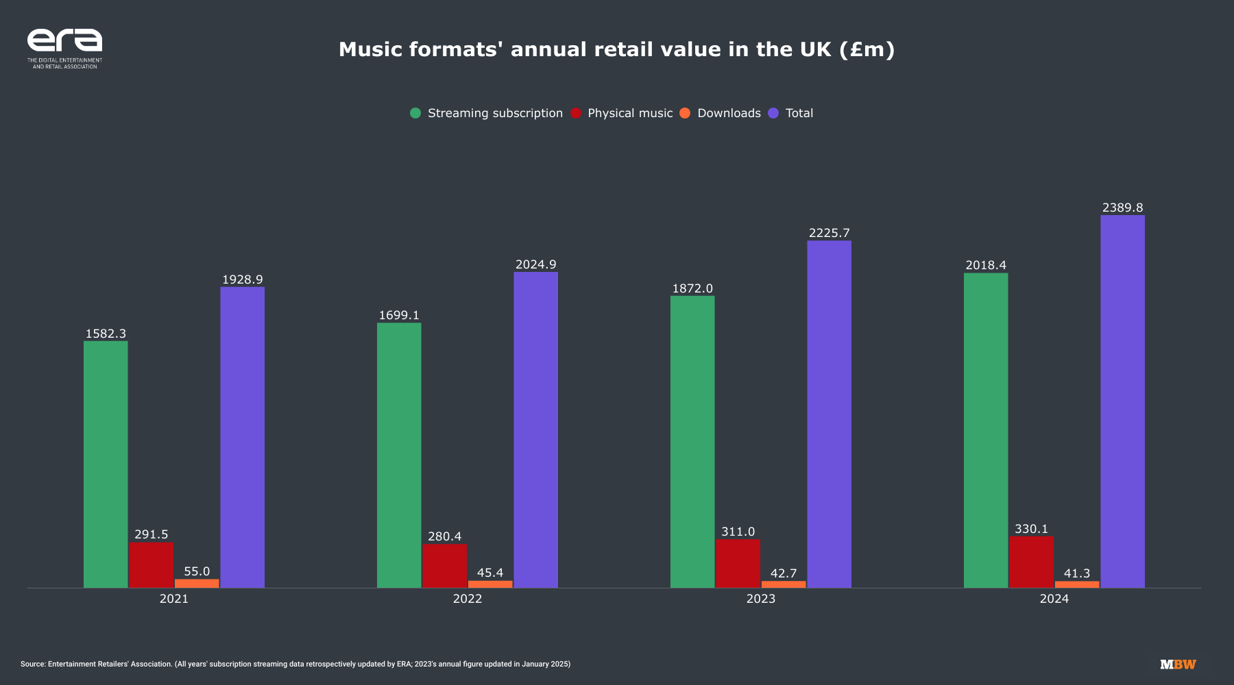 Annual retail value of recorded music formats in the UK, via ERA (2021-2024)