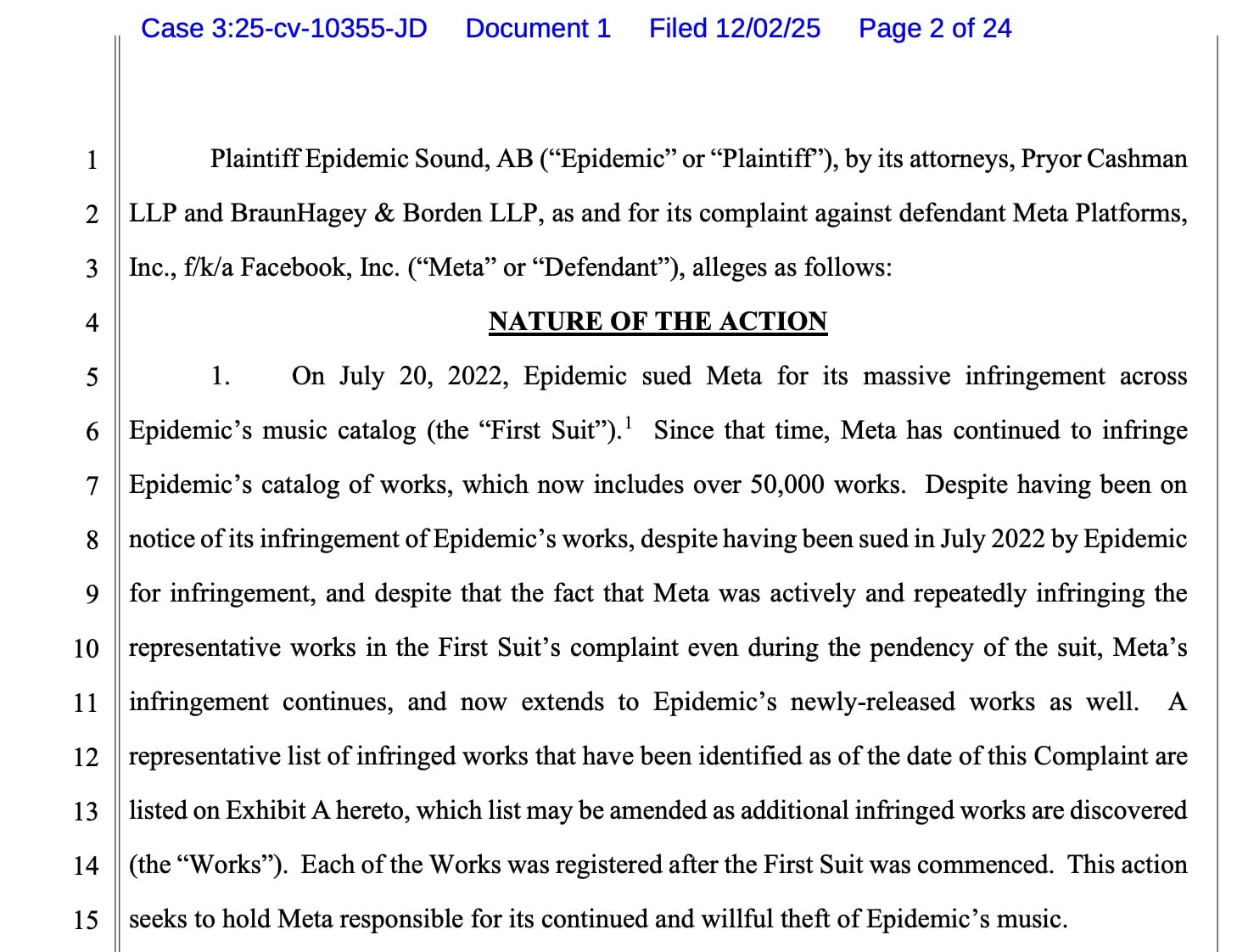 “Despite having been on notice of its infringement of Epidemic’s works, despite having been sued in July 2022 by Epidemic for infringement, and despite that the fact that Meta was actively and repeatedly infringing the representative works in the First Suit’s complaint even during the pendency of the suit, Meta’s infringement continues,” the complaint states.Music Business Worldwide