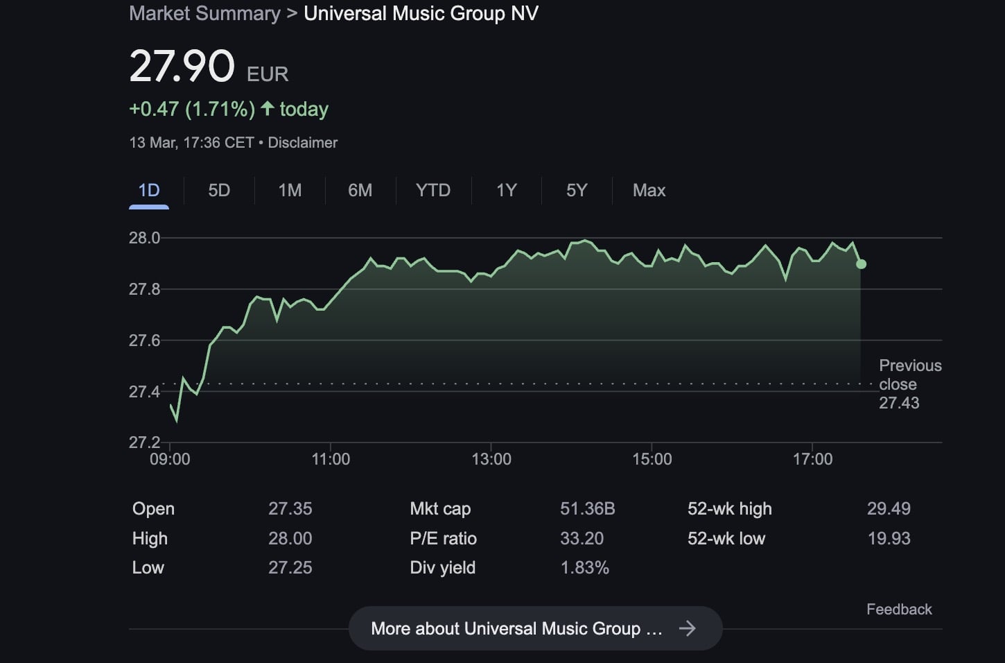 Universal Music Group, which is listed on the Euronext in Amsterdam, saw its share price close at €27.90 on Thursday.