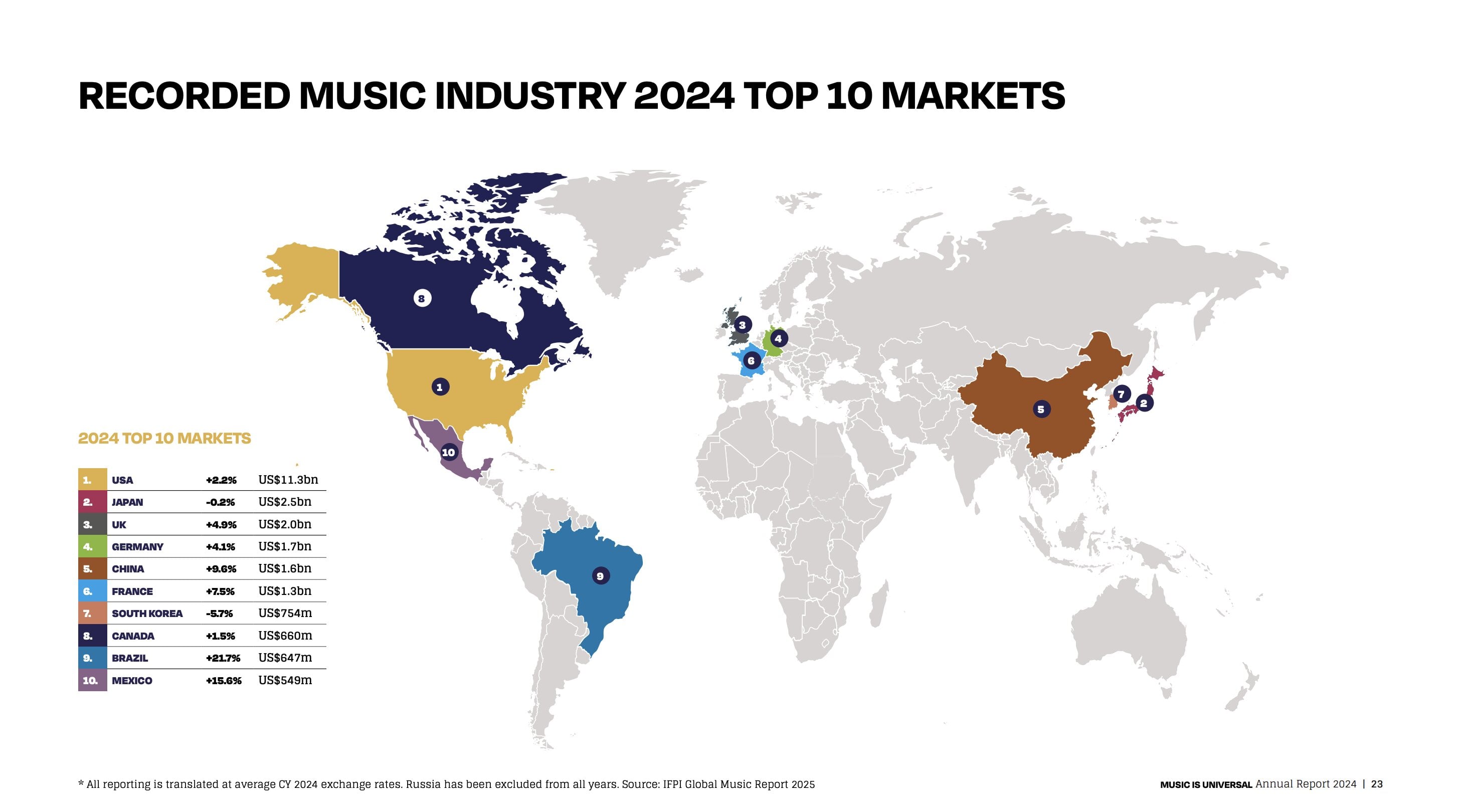 China was the world’s fifth-largest territory for recorded music trade revenue in 2024 across all formats, according to IFPI statistics, overtaking France – with Germany now in its sights (image source: UMG’s annual report).