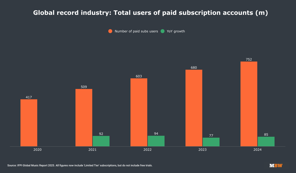 IFPI’s report identifies subscription streaming as the key driver of growth globally. Subscription streaming revenues rose by9.5% YoY globally last year, while users of paid subscription accounts grew 10.6% YoY to 752 million globally (see below).
